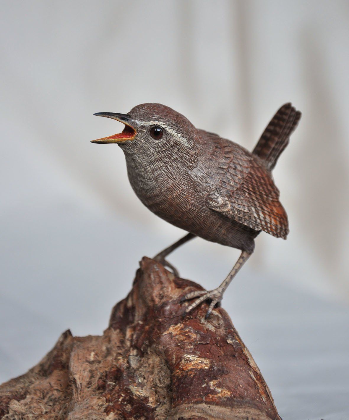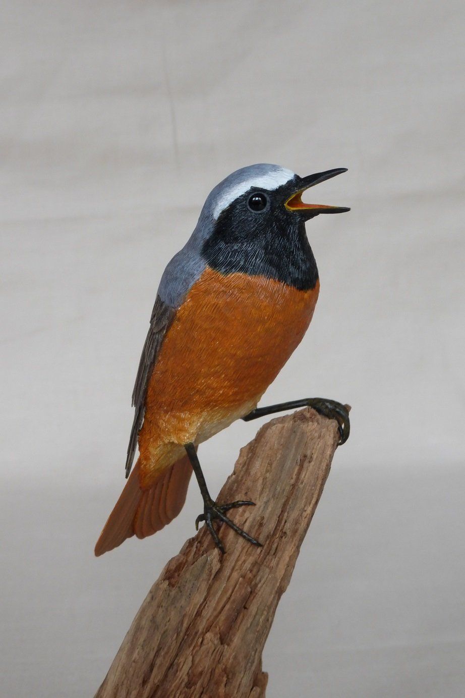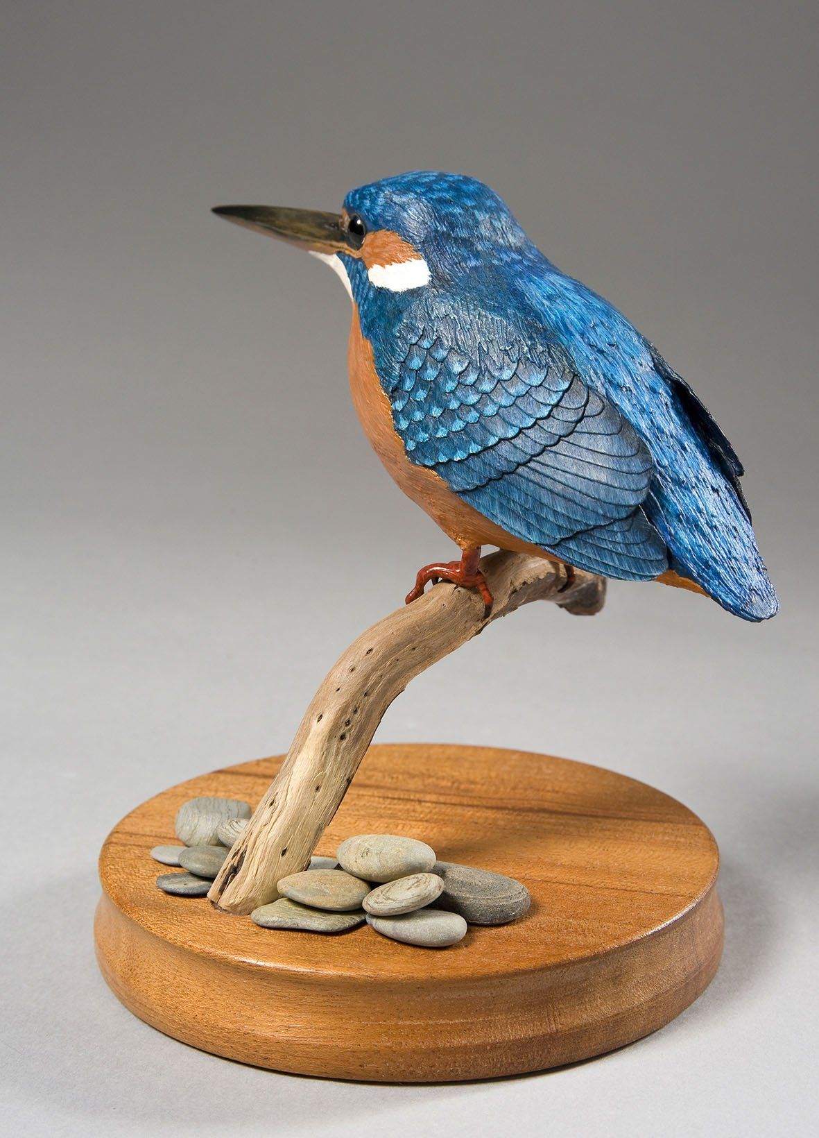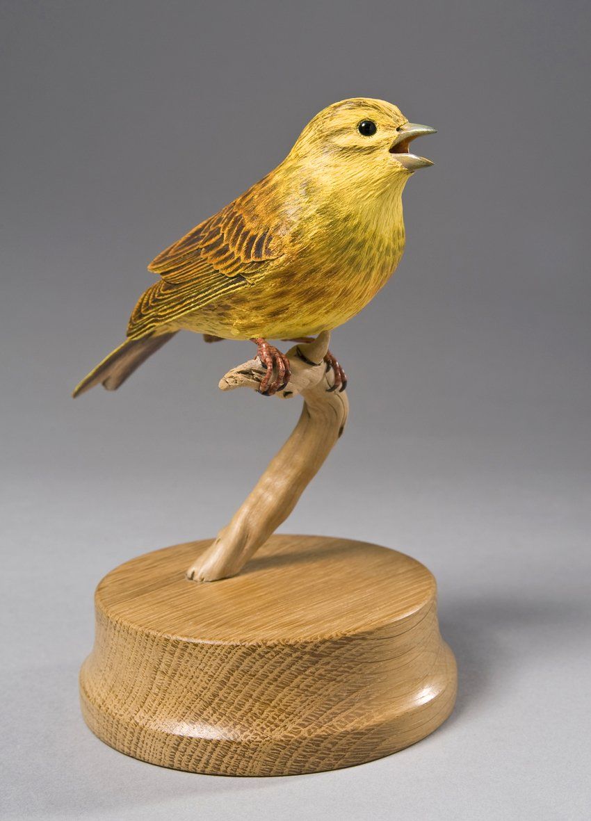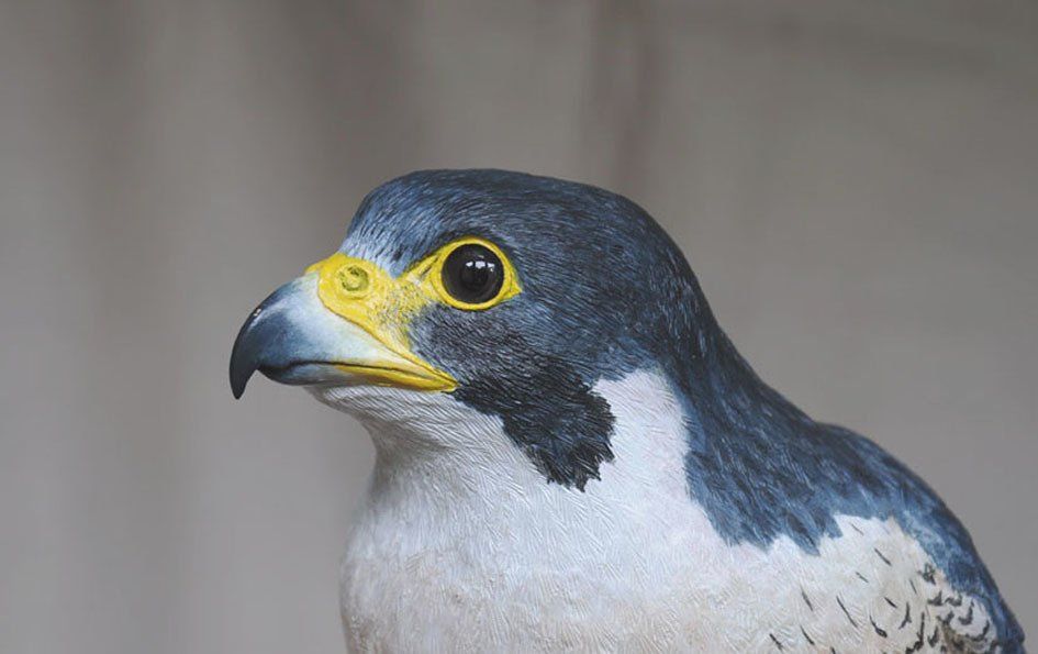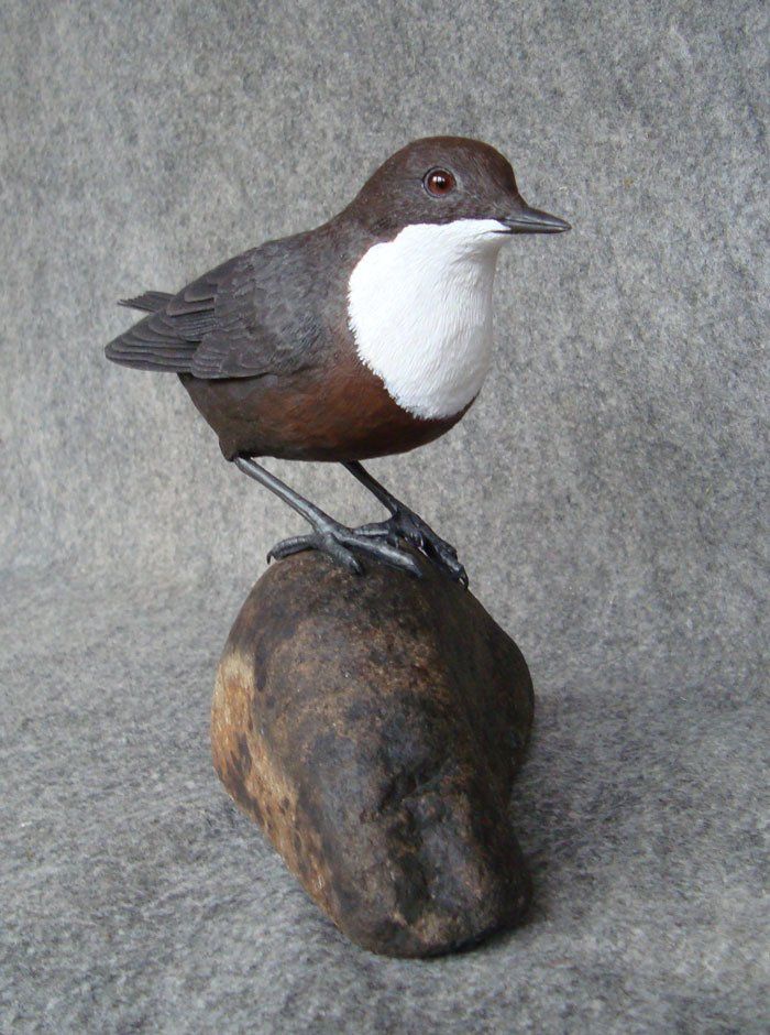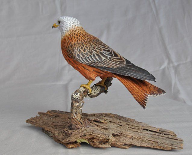 The elements comprising these structural features are then variously constructed: feathers and wings are produced using different grades of paper, card, textile, styrene, pvc and acrylic sheets; legs, feet, beaks, other appendages and surface detail are carved in wood or sculpted using polymer clay and epoxy putty; for birds and mammals taxidermy glass eyes are used.